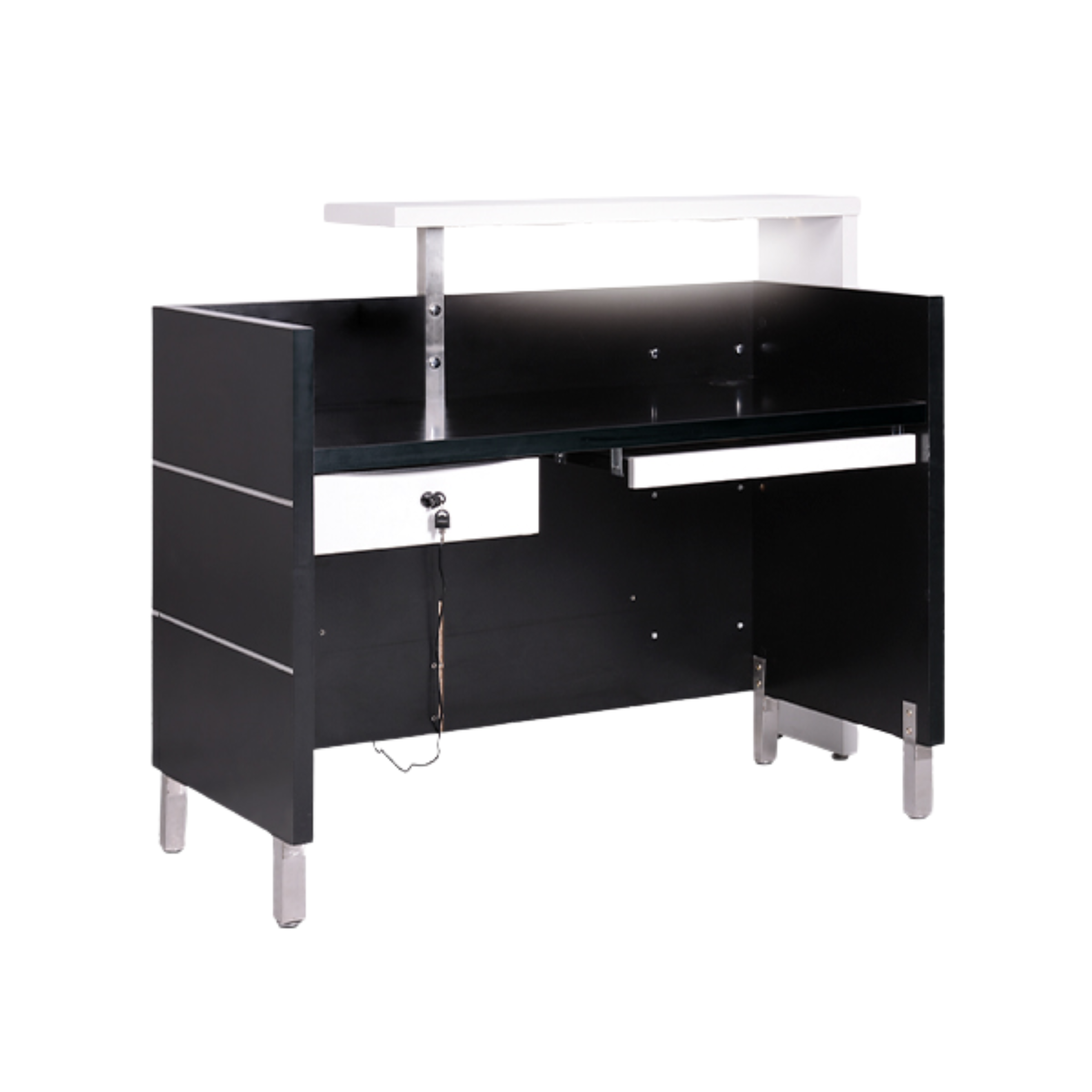 Birou de recepție elegant pentru saloane de coafură și înfrumusețare cu iluminare LED sub raft. Accesorii opționale: sertar cu cheie de securitate, suport pentru tastatură și calculator. Conceput din materiale MDF laminate și frontală lăcuită.