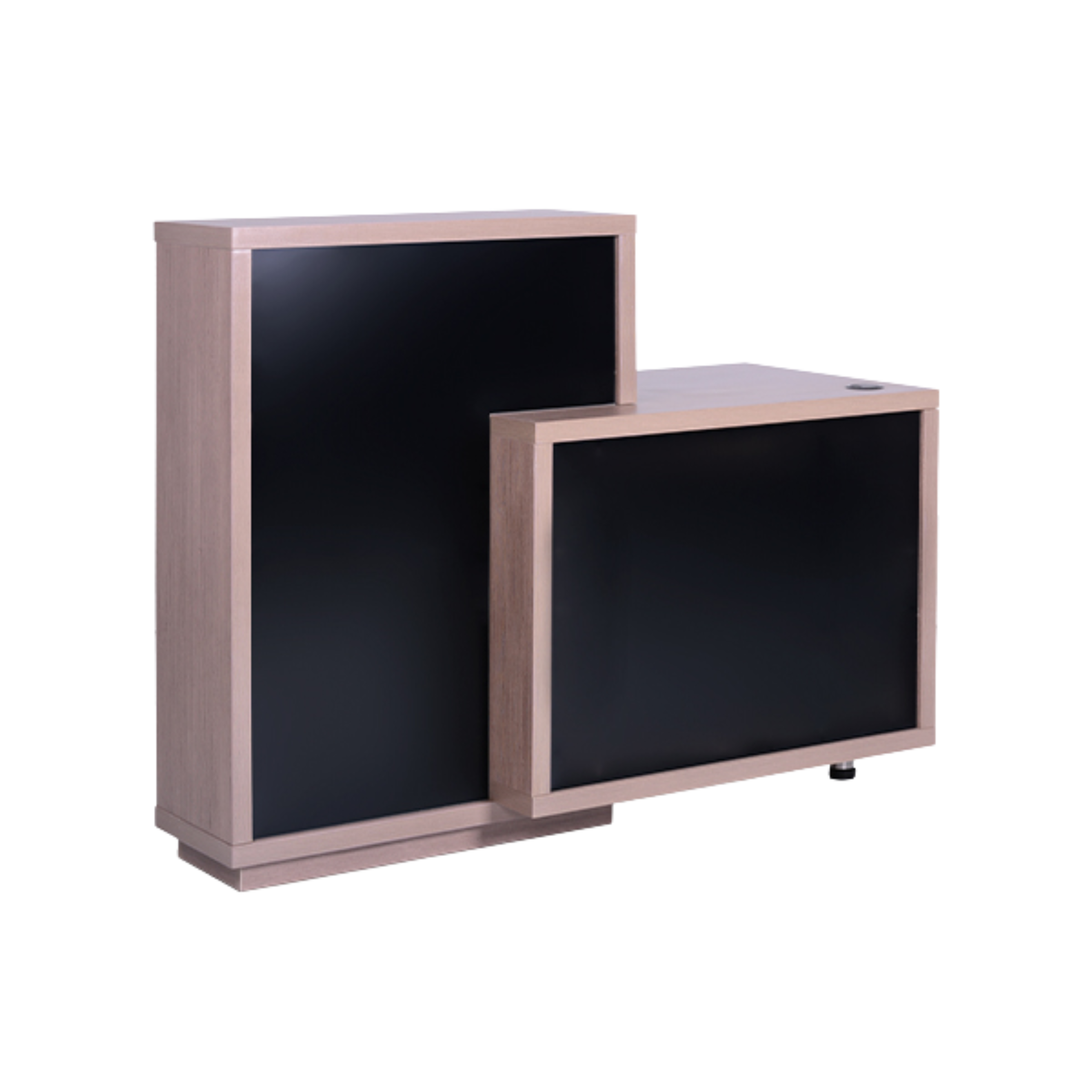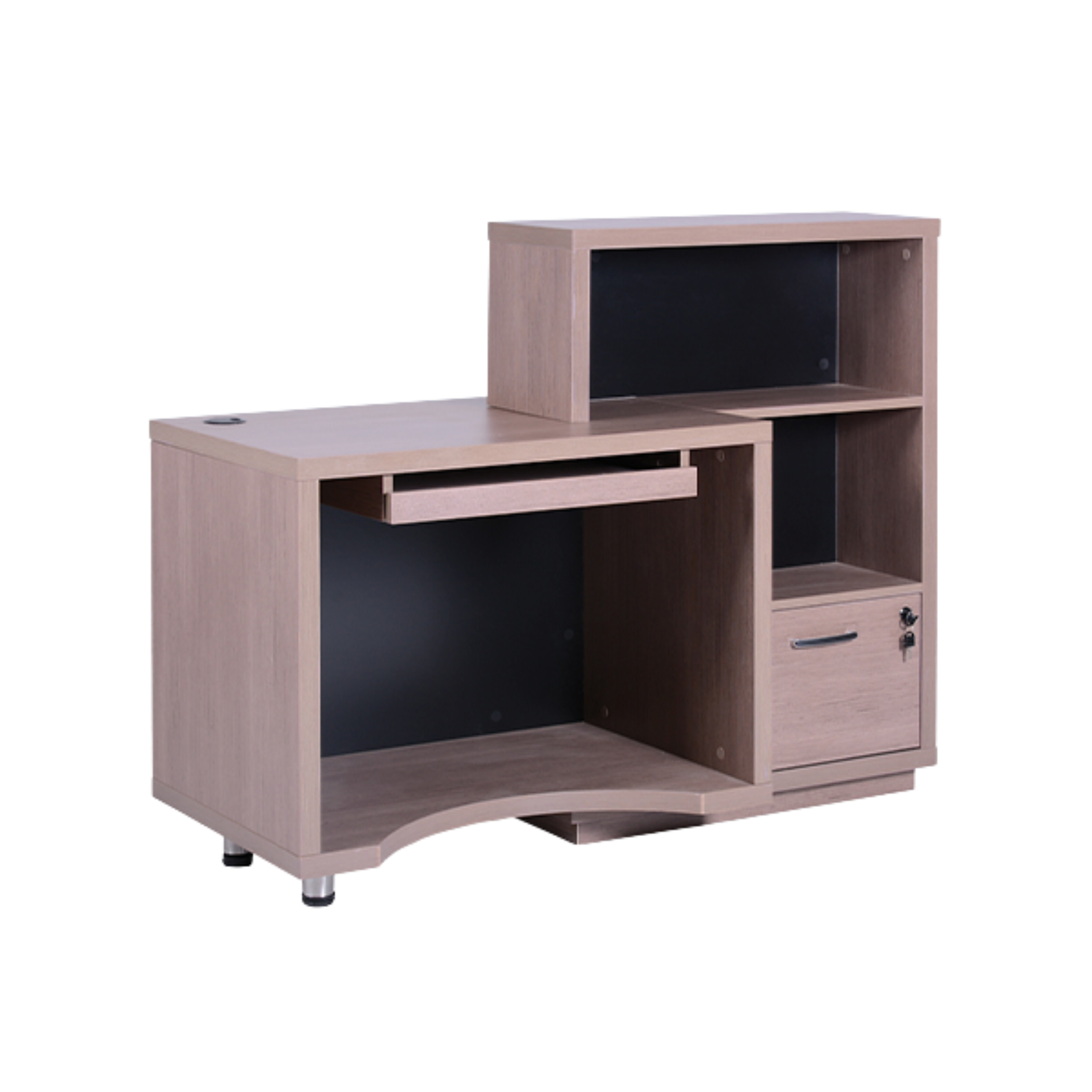 Birou de recepție elegant pentru saloane de coafură și înfrumusețare, cu design sofisticat din pin negru satinat și gri. Include rafturi auxiliare, sertar cu cheie de securitate, suport pentru tastatură și calculator.